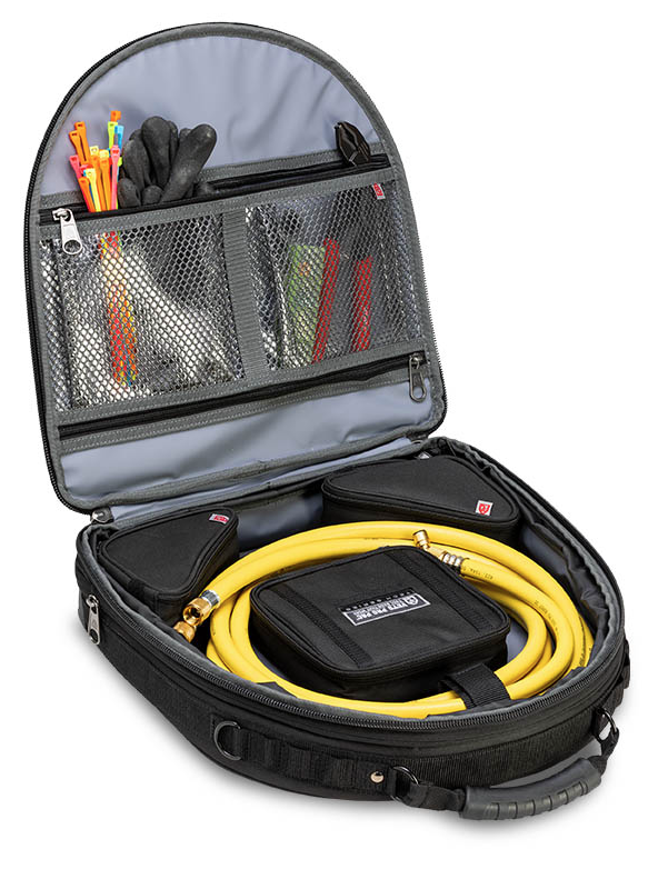 The HOSE HAULER BLACKOUT is a “blacked-out” version of the existing HOSE HAULER with a few added features. It includes a “suitcase-like” expansion feature that increases internal capacity, allowing you to fit more hoses, store a refrigerant scale with your hoses and gear, or hold up to 100 feet of extension cord.